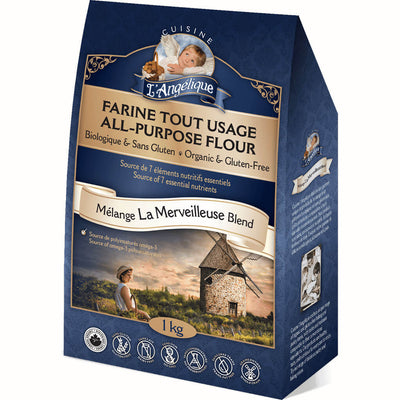 Prix d'origine $0.00 - Prix d'origine $155.40Prix d'origine $0.00$15.54$15.54 - $124.32Prix actuel $15.541.0kg | $15.54 / kg| $7.05 / lben stockNotre farine biologique "La Merveilleuse" sans gluten "Tout usage" est fabriquée au Québec par Cuisine l'Angelique. C'est une farine de grains enti...
